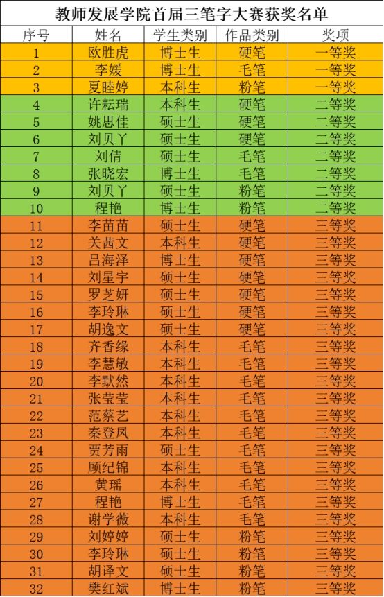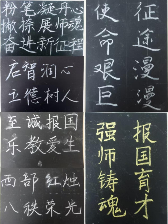 本次比赛分为毛笔字、粉笔字和硬笔字三个项目,书写主题围绕“强师报国”,共有90余名同学报名参赛。经过同学们“硬核”比拼和评委们认真评比,本次比赛共评选出一等奖3名,二等奖7名,三等奖22名。
