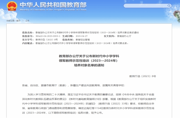 办公厅关于公布新时代中小学学科领军教师示范性培训(2023—2024年)培养对象名单的通知