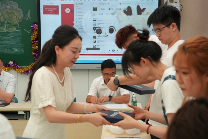 典礼现场,廖婧茜为毕业生赠送学院精心设计的2024届硕士研究生毕业礼物。